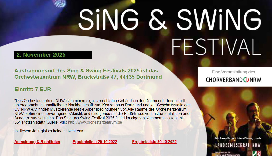 In diesem Jahr wird in Dortmund wieder um den begehrten Titel Meisterchor der Chorverbandes NRW gesungen. Wie auch schon zuvor werden wir antreten und hoffentlich den Titel Konzertchor gegen den Titel Meisterchor eintauschen zu können. Unser Auftritt ist um 10:00 Uhr und wir singen drei Stücke. Die Bekanntgabe der Ergebnisse wird um 13:00 Uhr sein.